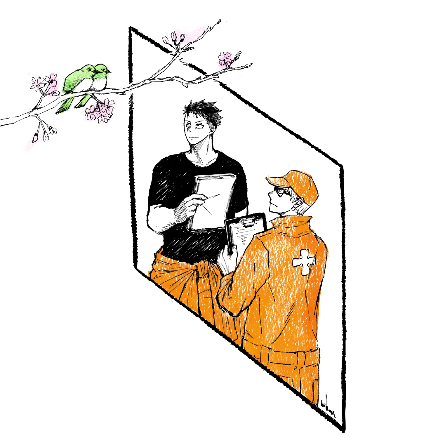 SS 桜を彫りたい紅丸の話5 続きを読む その日紺炉は、町の破壊を手伝ってもらった礼とは別に、ひとつの提案を携えて元第8特殊消防隊詰所・現世界英雄隊本部を訪れた。 「部隊合同での花見か、いいですね。折角だから送別会も兼ねて、集まれそうな人みんなに声をかけましょう」 「送別会ということは、誰か離職を?」 「ああ、退職ではないんですがマキ中隊長が来月から産休に入るんですよ。無事に産まれたら火縄も育休を取るし、しばらくの間は寂しくなりそうです」 目を細め朗らかに笑う顔は、まるで自分自身が父親になるかのように嬉しそうだった。(元)第8は隊というより家族みたいなものなのだと、そう言っていたのは修行に訪れたシンラだっただろうか。 「先日は若の酔狂にも付き合ってもらっちまって……随分派手に暴れてたけど、体は平気か?」 「全然! 賑やかなのは好きだし、良いトレーニングにもなりました。宴会までは残れなくて残念だったんで、今度の花見で雪辱を果たすつもりです。--案件としては、こんなもんですかね?」 「じゃあー、ついでにウチのしょうもない相談でも聞いてもらおうか。実は若が……」 「また何かしたんですか?」 「墨、じゃなくて……たとぅーを入れるって言い出して」 「うわっ、あの時のシンラを思い出す…! 男の子って、やっぱ一度はそういう時が来るんですかね」 「男の"子"といえる年でもないってのに」 「でも、浅草の原国式のタトゥーは粋でかっこいいじゃないですか。シンラの場合は人格もおかしくなっちゃったからイメージ悪いけど、タトゥー入れるだけだったら特段たいした問題にもならなかったかと」 説明と共にそう遠くはない記憶に思いを巡らせているのか、口の間から乾いた笑いを漏らしつつ、視線を斜め右にさ迷わせる。桜備の珍しい表情を見た紺炉も、浅草に第8が秘密基地を構えていた時に垣間見たシンラの”反抗期”をぼんやりと思い出す。 「悪いこたァないが、なにやら変な感じでね。総隊長から見て、最近若…いや、紅のことで、何か気になる節はねェかな」 「気になる?」 気になることねえ…と、縫い目のある首を見てる方が不安を覚えるほどにまで傾け考えていた桜備だったが、突然すっ、と執務机の大きな席から無言で立ちあがったと思いきや、そのまま紺炉のすぐ横にまで歩み寄ってきた。ふいの行動と詰められた距離にぎょっとした紺炉の体が、反射的に軽く強張る。 「ほら、俺たち丁度身長同じくらいでしょ。だから分かってくれるんじゃないかと思うんですけど、見上げられると照れませんか?」 「照れる?」 「こう、横並びで立ってる時なんかに、こっちを見上げてくる顔が妙に幼く見えて。酒に酔った時の笑顔もそうだけど、あんな顔されると、ちょっと調子狂いますね」 頬を指先で掻きながら照れ笑いを浮かべる桜備の細まった目。本人が言う通り紺炉の目線とほぼ同じ高さだった。その目からそろりと視線を逸らし、いつも紅丸の顔がある辺りにさ迷わせる。 あんな顔、と言われても、どんな顔か分からない。 おい紺炉、と見上げてくる紅丸を思い浮かべてみたが、それは勝気で不遜で、ある意味愛おしいくらいの生意気さに満ちている。照れるようなもんじゃない。幼い頃からよくよく知っているつもりだが、それだって今の紅丸の全てとは言い難いことを思い知らされた気がした。 「すいません。俺が言いたいのは、とどのつまり気になることはないってことです。これまでの働きにも、文句のつけようがない。この国、いや、この世界にとってお二人とも代えがたい存在です。頼りにしてます!」 距離が近いまま真剣な面持ちで言い連ねる桜備からこの男特有の妙な圧を受け、耐えきれなくなった紺炉は思わず一歩二歩と後ずさる。 そういう話ではないのだけど、と返すべきか数秒ほど逡巡し、止める。 「そりゃ、ありがたい……若にも伝えとくよ」 情人云々と、紅丸より先にこちらにカマをかけなくて良かった。いや、たとえ投げかけたとしても、元より紺炉の意図などサッパリ伝わりそうにない。 紅丸の真意の程は測りかねるが、たとえどう転んだとしても、大地に根を張る巨木のようなこの男はビクともしないだろう。 じゃあまた、とそそくさとその場を後にした紺炉は、廊下に出てからほぉ、とため息を吐いた。まるで自らがスッパリと振られたような気分になり、かえって溜飲が下がるのを感じていた。 「早とちりで、思い過ごしか。紅のこととなると心配が先立っちまってなさけねェな」 畳む 2025/03/18